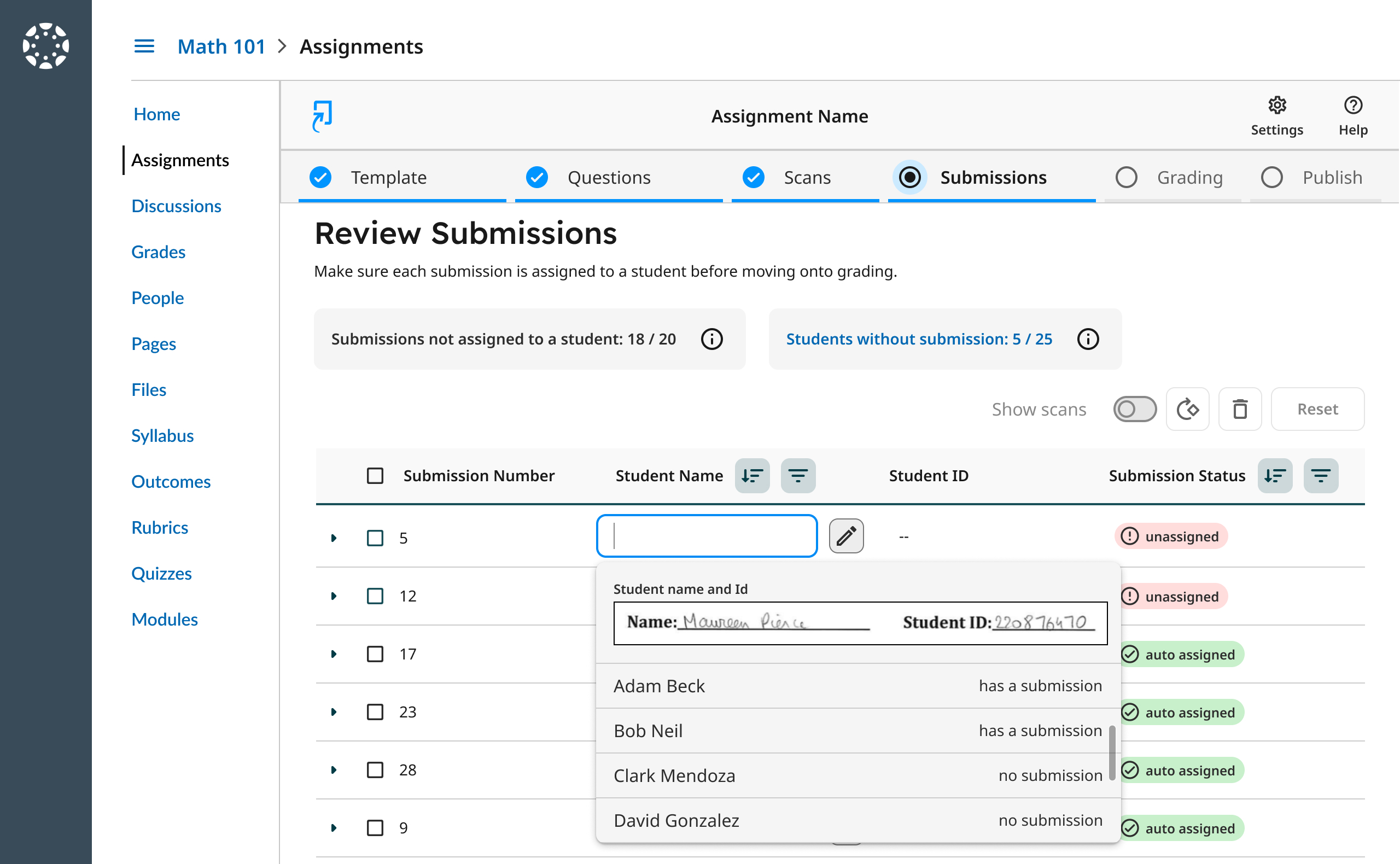 Additionally, instructors can easily identify which students didn’t match to a submission and quickly assign it to them, providing a necessary manual intervention when needed.