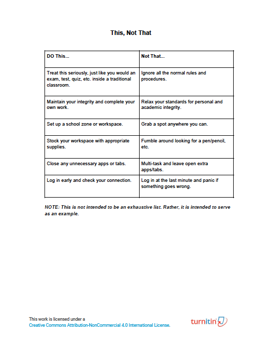 Wondering how you can help students establish the right mindset to take assessments seriously? Both in-person or remote exams require preparation in order to be successful. Equip your students with the right approach using a "This, Not That" matrix that offers concrete examples that they can revisit to help build the proper mindset.